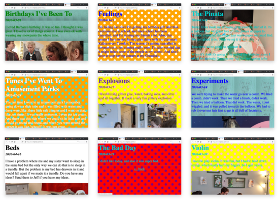 First she’ll dictate the post body, then I’ll ask about a title, then I’ll ask about colors. Sometimes her color preferences can be a bit much, and I kind of regret learning the CSS for polka-dotted backgrounds. I’ll ask if she wants any pictures on the post, and we’ll either look through my photo archive or go take a picture of something. I’ll usually take pictures during activities if I think there’s a chance she’ll want to use a picture in a post; at some point that kind of anticipation will be her job, but not yet.