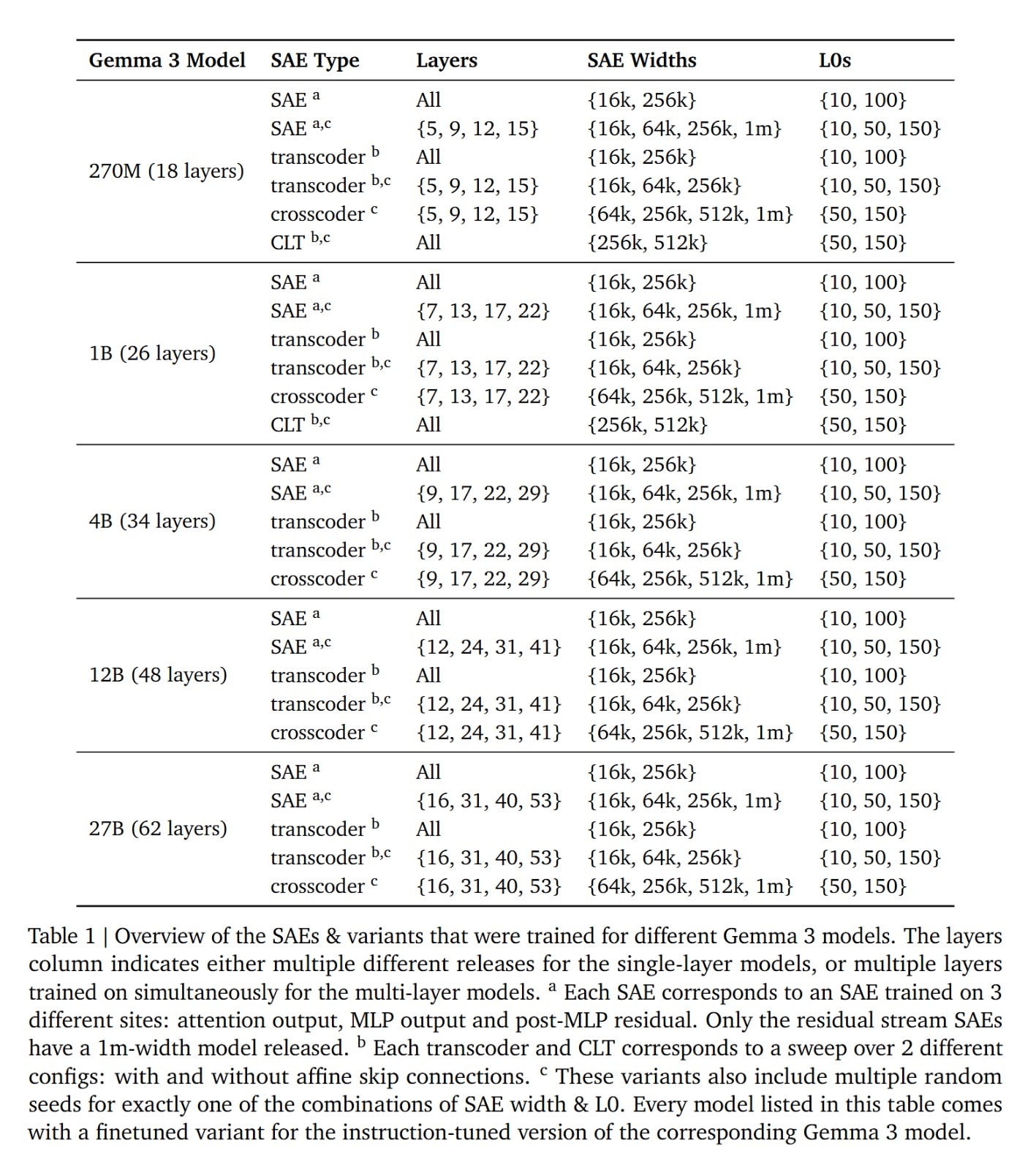 This release contains SAEs trained on 3 different sites (residual stream, MLP output and attention output) as well as MLP transcoders (both with and without affine skip connections), for every layer of each of the 10 models in the Gemma 3 family (i.e. sizes 270m, 1b, 4b, 12b and 27b, both the PT and IT versions of each). For every layer, we provide 4 models (widths 16k and 262k, and two different target L0 values). Rather than giving the exact L0s, we label them “small” (10-20), “medium” (30-60) and “big” (90-150).
