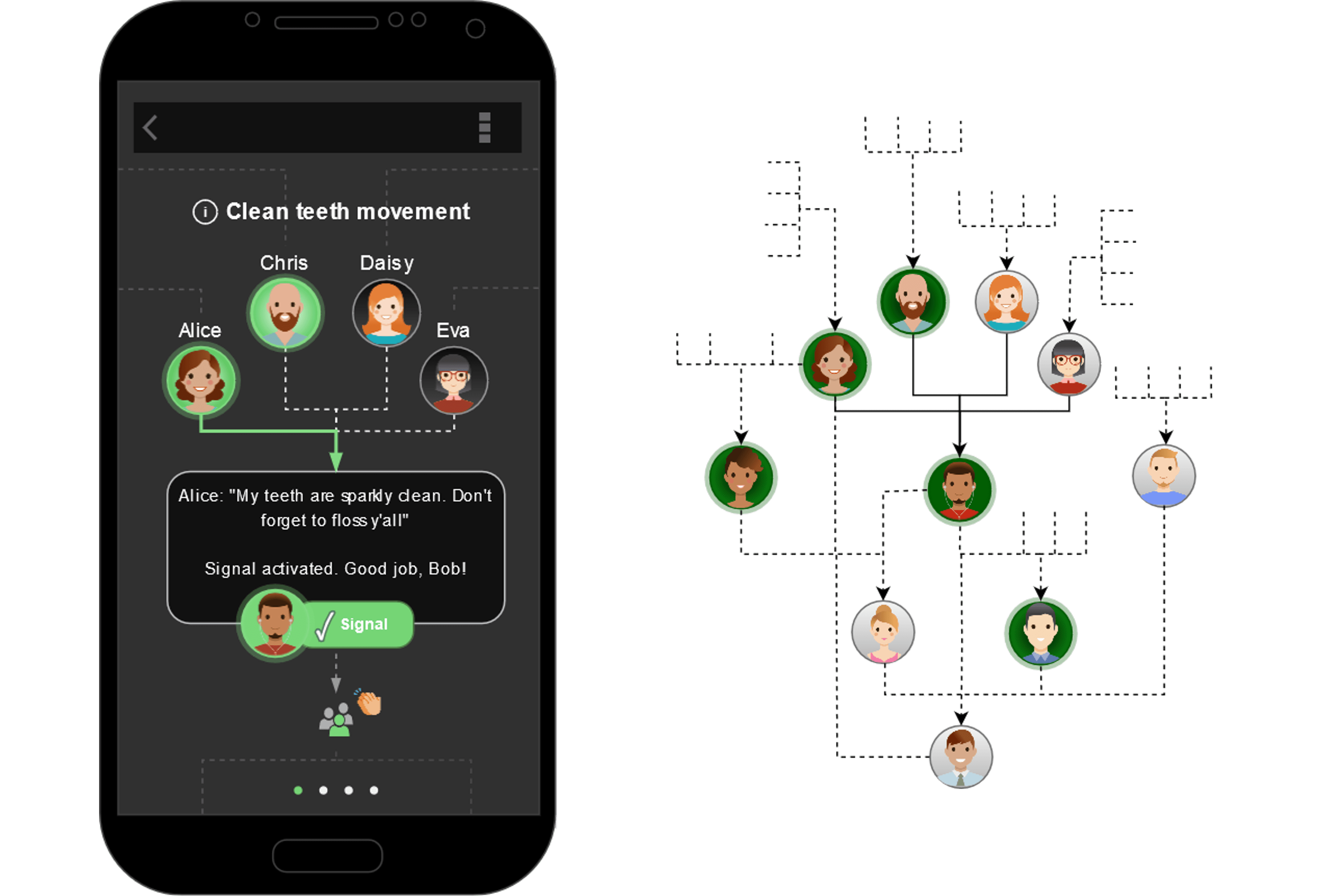 Which part of connecting to a conversation-free network and signaling to unknown receivers is appealing to an individual? In other words, is it also fun or rewarding to do? To address this question, let’s break down the experience of example user Bob (see figure 1). Bob has joined the ‘Clean Teeth Movement’, a network of people who coordinate with each other so that they remember to floss daily, in addition to brushing at least twice daily.