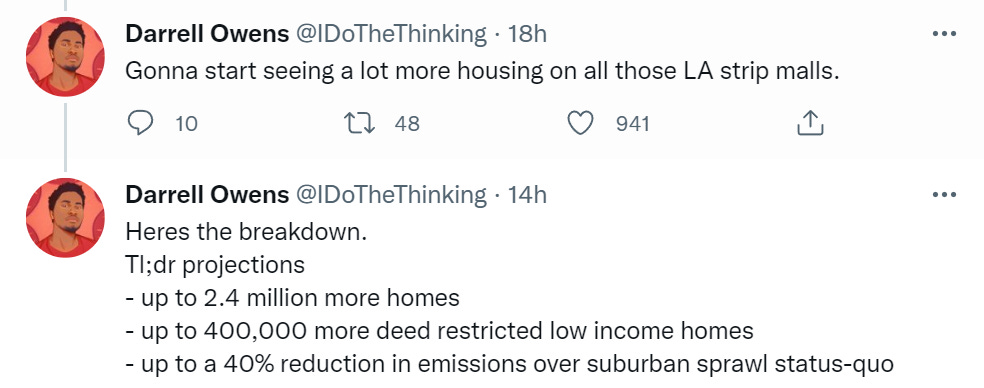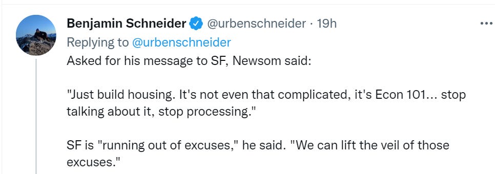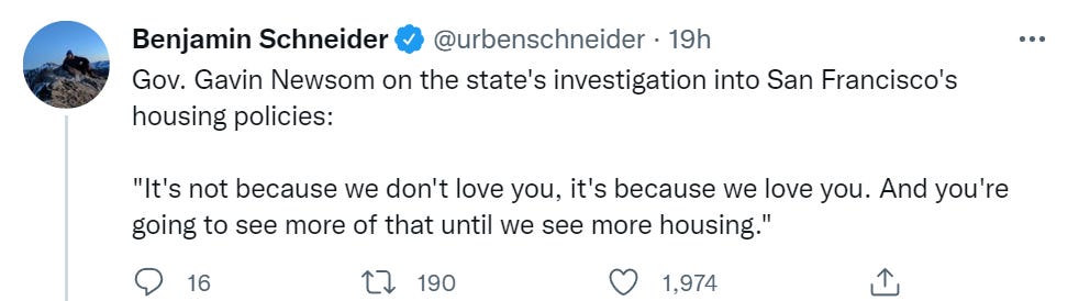 Help is on the way elsewhere in the state, at least. California signs its big zoning reform into law (substack post).