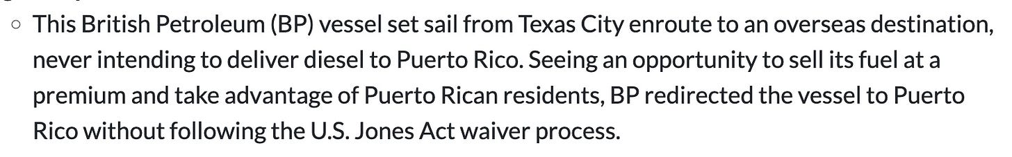 None of the few remaining Jones Act compliant ships were remotely near Puerto Rico, and there was no sign of any such ship attempting to ship in fuel at any price. Meanwhile, the usual suspects defended their monopoly even during an emergency in which they had nothing for sale.