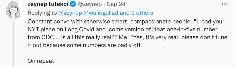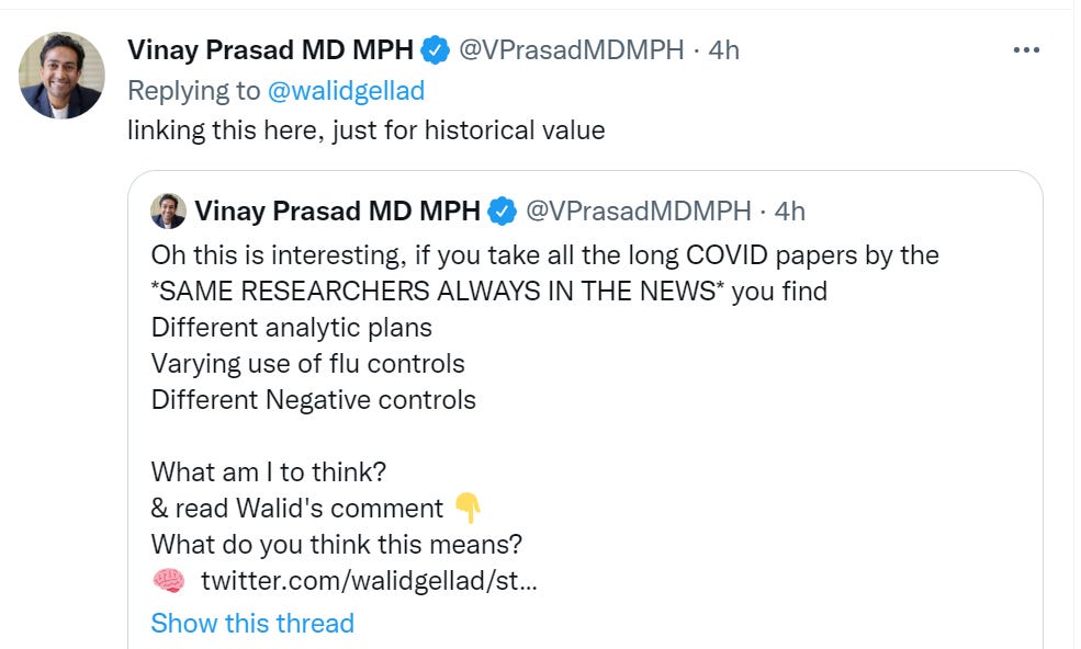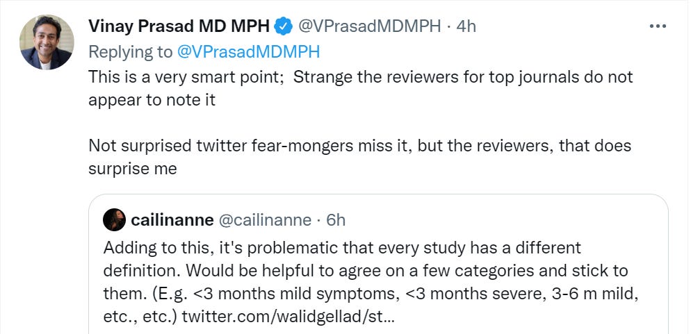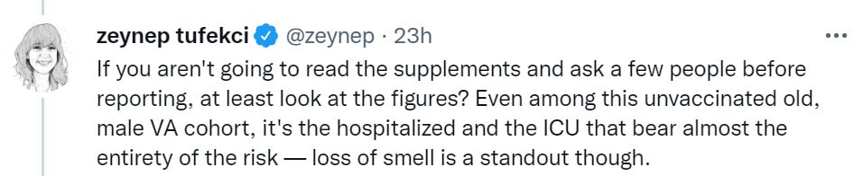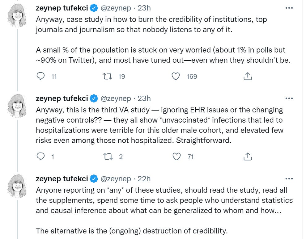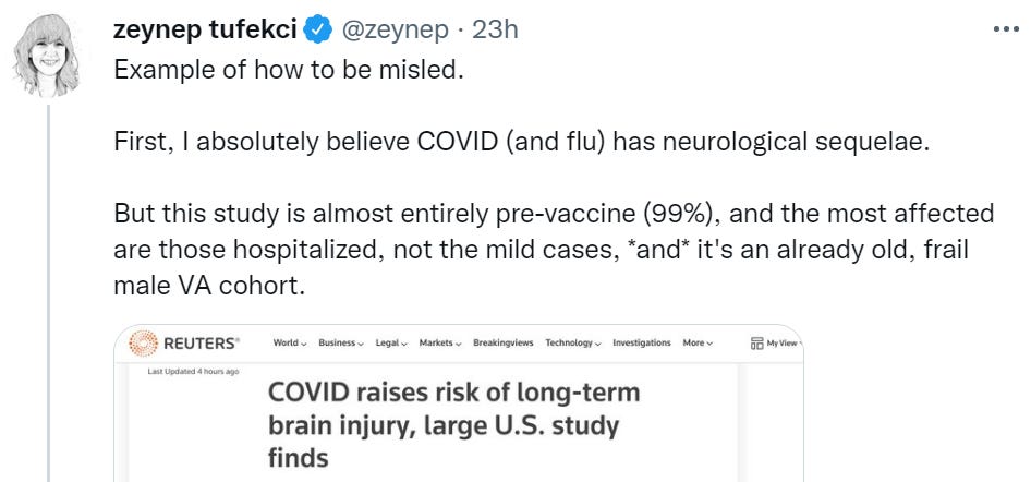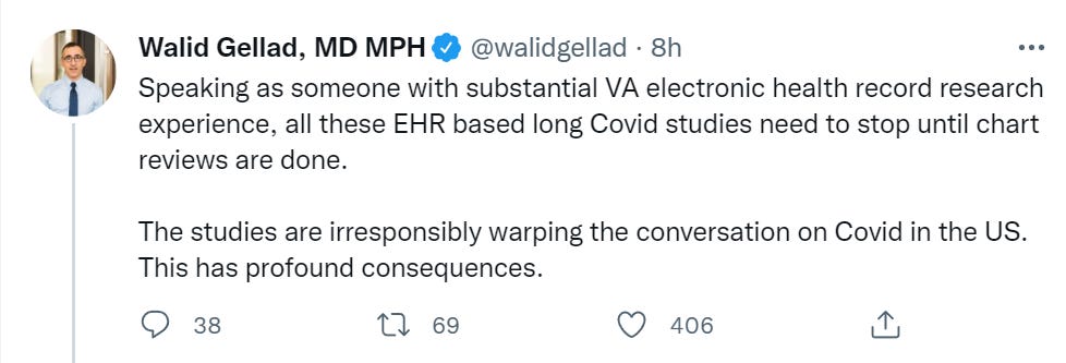 Zeynep Tufecki, Bob Cumming and Walid Gellad expressing continued frustration at having to constantly respond to the same misleading VA Long Covid studies.