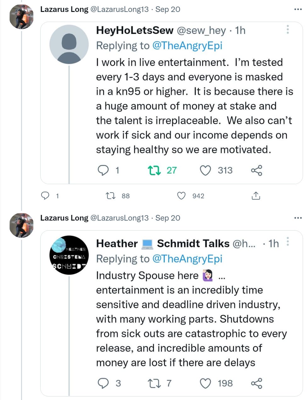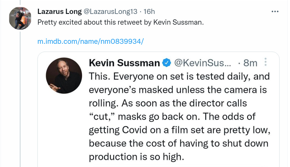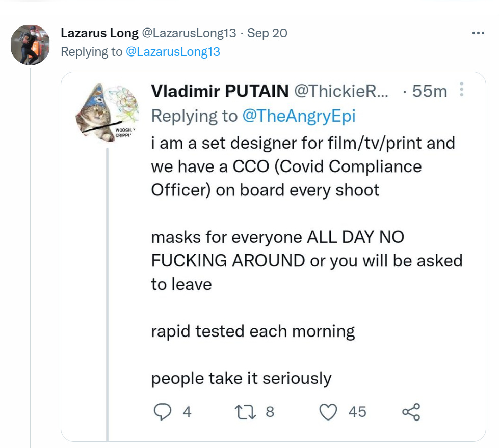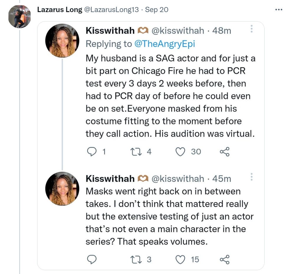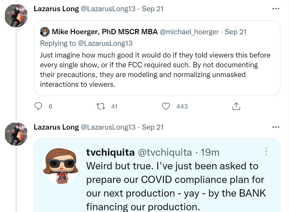 It’s all crazy expensive in time, money and annoyance, as they all can attest. Yet some people are worried that by not filming in masks they are ‘modeling unmasked behavior.’ The thread author thinks that these actions prove everyone else should be doing this stuff too, or at least some important portion of it?