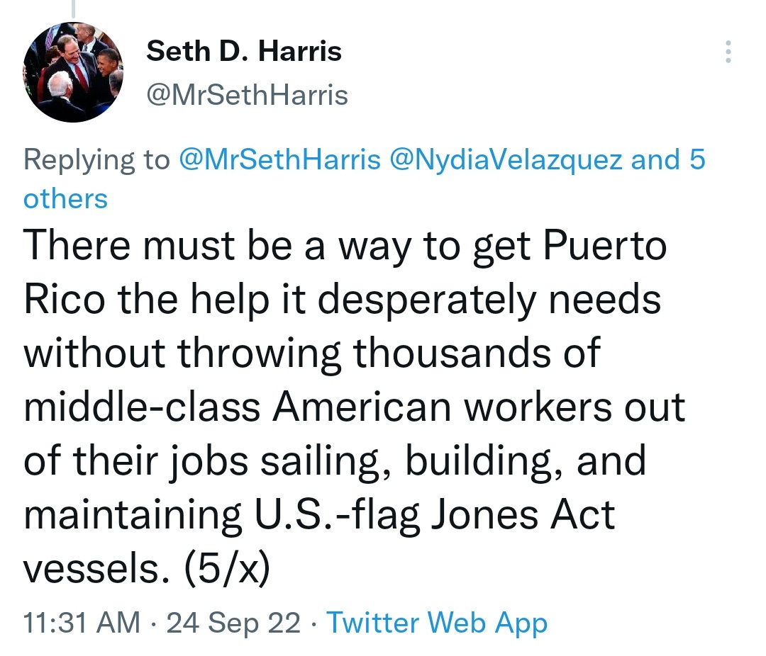 You have to love this claim that that Jones Act does not impact fuel shipments to Puerto Rico ‘at all’ because it gets its fuel from non-American sources. Which presumably is a claim that without the Jones Act, Puerto Rico still wouldn’t get its fuel from American sources? And also implies, of course, that zero American jobs would be harmed by getting a Jones Act waiver here on this, since nothing would change.