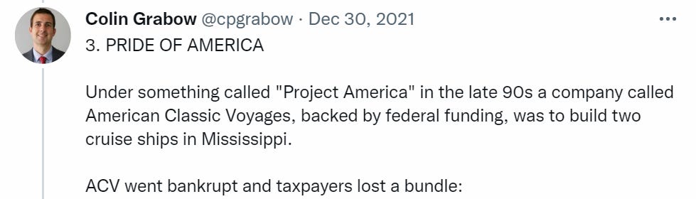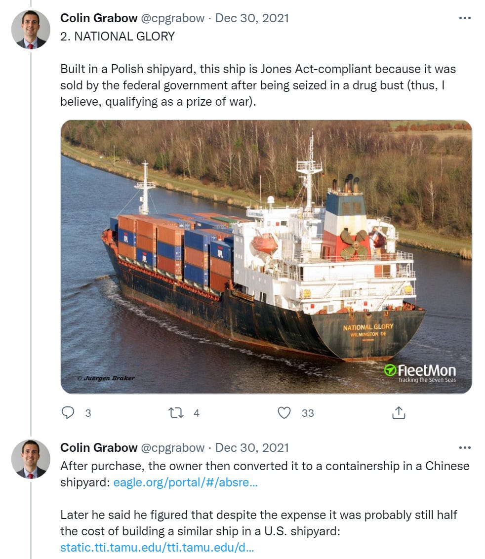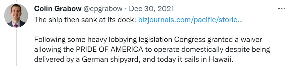 It does not get less bizarre after that. The list is full of stories of ships that are operating decades after they would normally have been scrapped, that needed individual congressional in order to operate, that did every possible alteration in a foreign shipyard because American shipyards have been effectively destroyed for all competitive purposes by the Jones Act shielding them from competition.