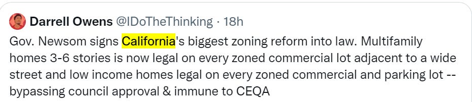 This caps off 40+ laws ‘signed to increase housing production’ ‘and access’ this legislative session alone in California. The list is at the link, at least some count.