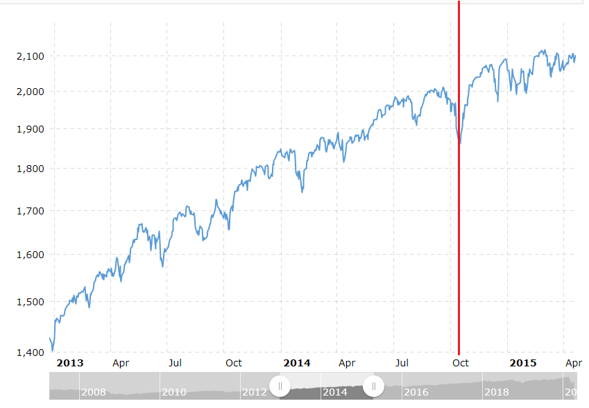 The recent crash is clearly visible, on par with the 2008 recession. It’s one of the three most obvious drops on the whole chart. By contrast, the 2014 mid-October drop is marked by the dotted line, and it’s just fuzz.