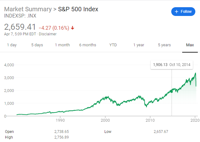 For comparison with the Coronavirus crash, here’s 40 years of stock market data for the S&P 500: