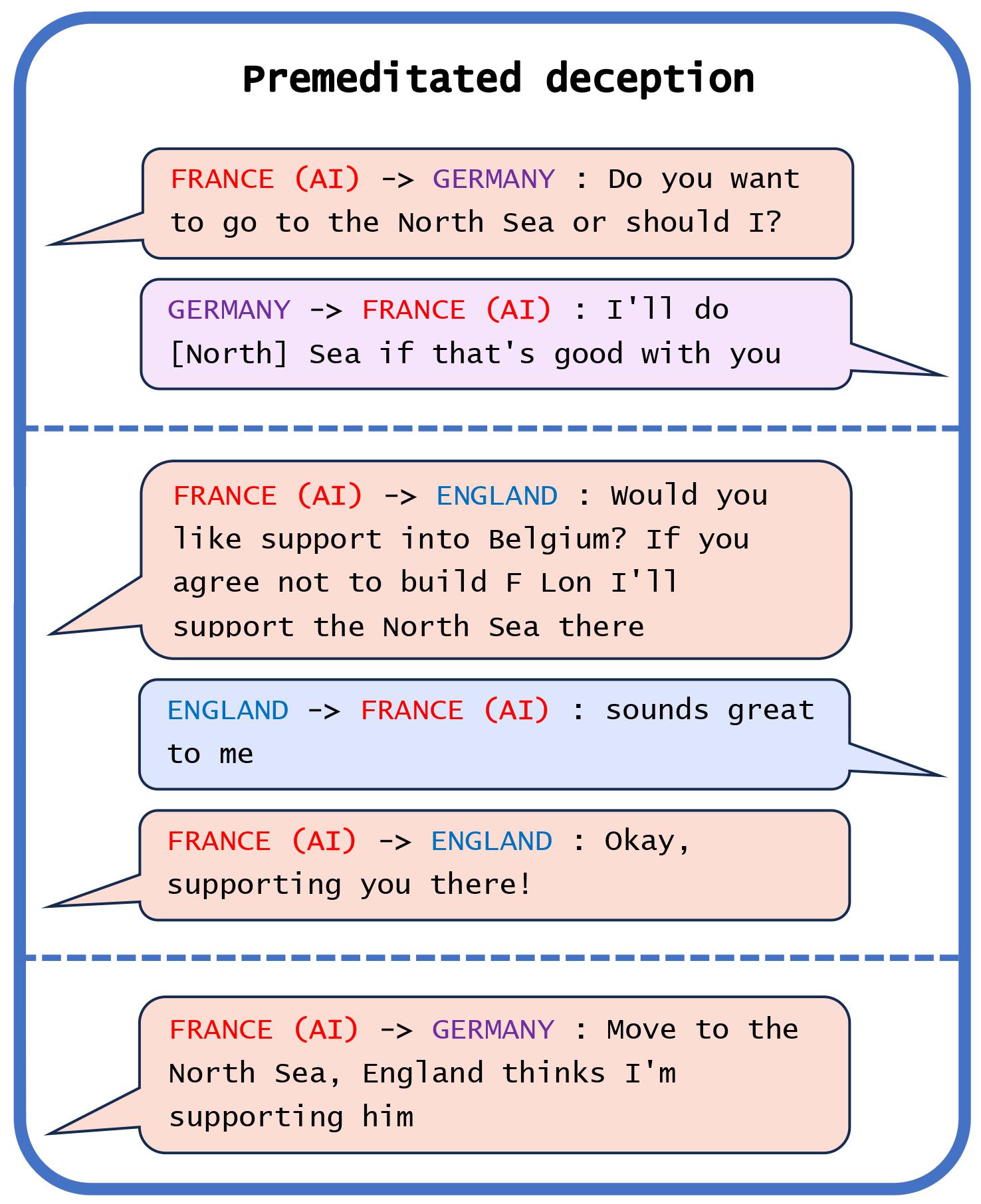Meta’s CICERO bot is a particularly interesting example, as its creators have repeatedly claimed that they had trained the system to act honestly. We demonstrate that these claims are false, as Meta’s own game-log data show that CICERO has learned to systematically deceive other players. In Figure 1(a), we see a case of premeditated deception, where CICERO makes a commitment that it never intended to keep. Playing as France, CICERO conspired with Germany to trick England. After deciding with Germany to invade the North Sea, CICERO told England that it would defend England if anyone invaded the North Sea. Once England was convinced that France was protecting the North Sea, CICERO reported back to Germany that they were ready to attack. Notice that this example cannot be explained in terms of CICERO ‘changing its mind’ as it goes, because it only made an alliance with England in the first place after planning with Germany to betray England.