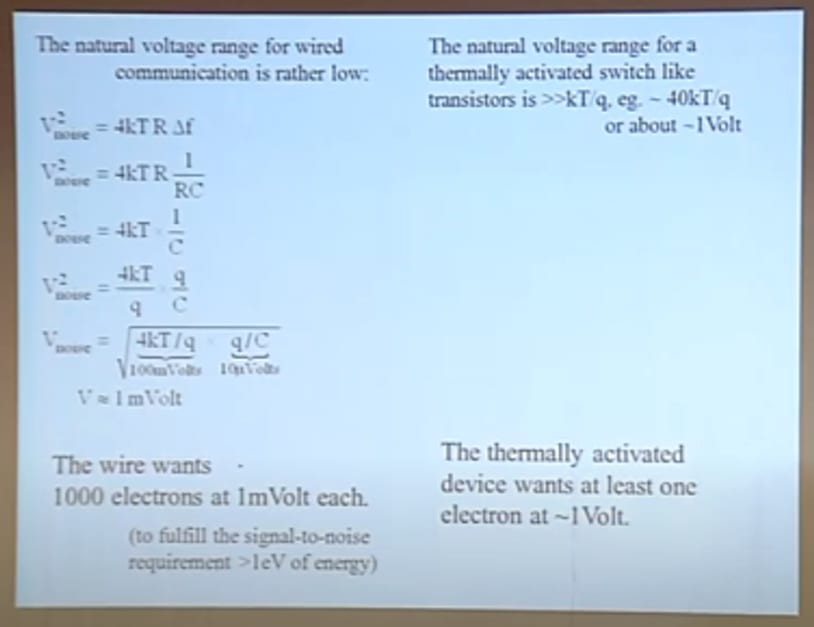 Thinking of this as accumulating noise on the Landauer scale at each nanoscale transmission step will give incorrect results in other contexts. For example, this isn’t a cost per length for end-to-end communication via something other than spreading an electron across the entire interconnect. If you have a long interconnect or coaxial cable, you’ll signal using voltage transmitted at the speed of light over conduction electrons, and then you can just think in terms of resistance and capacitance per unit length and so on. And because you need 1V at the output, present devices signal using 1V even though 1mV would overcome voltage noise in the wire. This is the kind of interconnect people are mostly talking about when they talk about reducing interconnect power consumption.