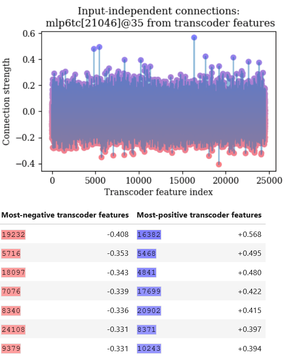Similarly, we saw that layer 6 transcoder feature 11831 contributes strongly. We looked at the input-independent connections from layer 0 transcoder features to this layer 6 feature, in order to see which layer 0 features cause the layer 6 feature to activate the most in general. Sure enough, the top features were 16632 and 9188 – the layer 0 semicolon features that we just saw.