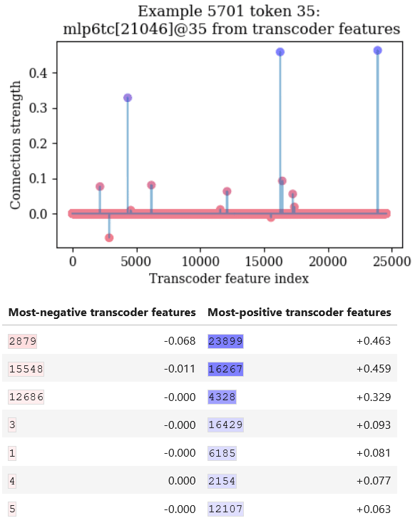 First, we looked at the connections from MLP0 transcoder features to MLP5 transcoder feature 12450.