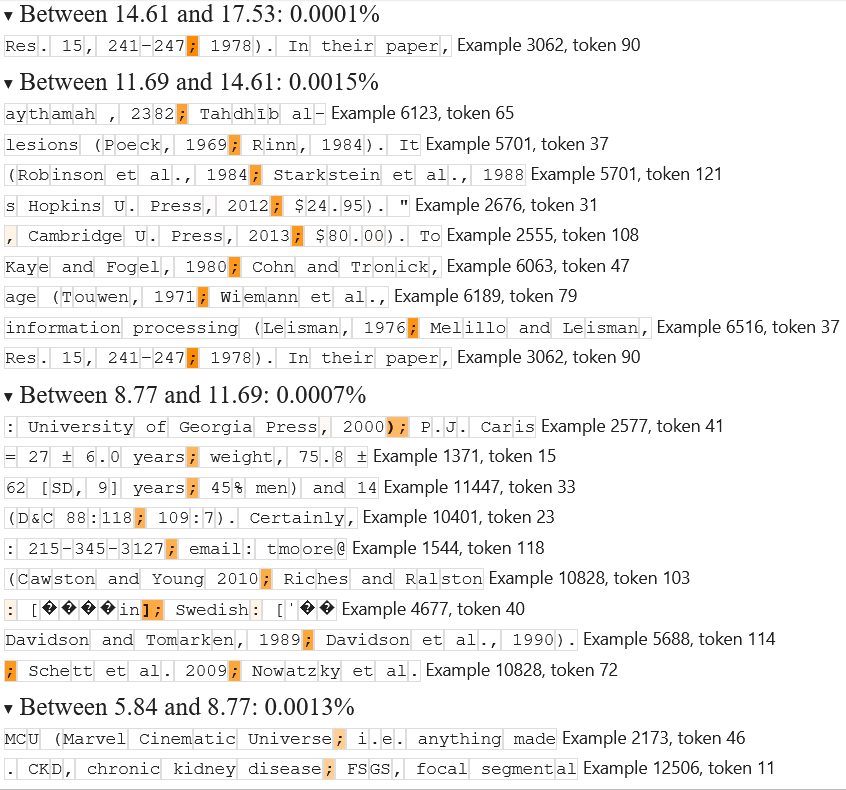 Yep – it turns out that the top examples are from semicolons in academic parenthetical citations! Interestingly, it seems that lower-activating examples also fire on semicolons in general parenthetical phrases. Perhaps a further investigation on lower-activating example inputs would have revealed this.