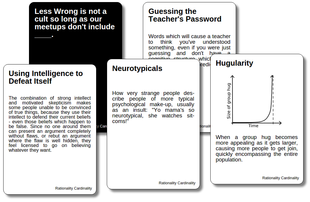 I’ve put a lot of thought and a lot of work into the cards, and they’re not just about humor; I also went systematically through blog posts and glossaries collecting terms and concepts that I think people should know about and be reminded of, and wrote concise explanations for them. It provides an easy way for everyone to quickly learn the jargon that’s floating around, in a fun way; and it provides spaced repetition for concepts that might not otherwise have sunk in.