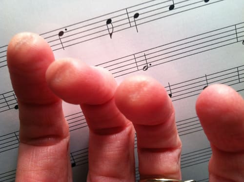 Obviously, this should be interpreted that these specific marks imply someone might be a violinist. This has been confirmed by my friend Gennie (who says it’s only likely to show up from intense practice or if you have delicate skin) and my friend Bella, who says that the position varies (she has one close to the one on the jaw in the picture but not the lower ones because she “had a good shoulder rest and didn’t play baroque style”).