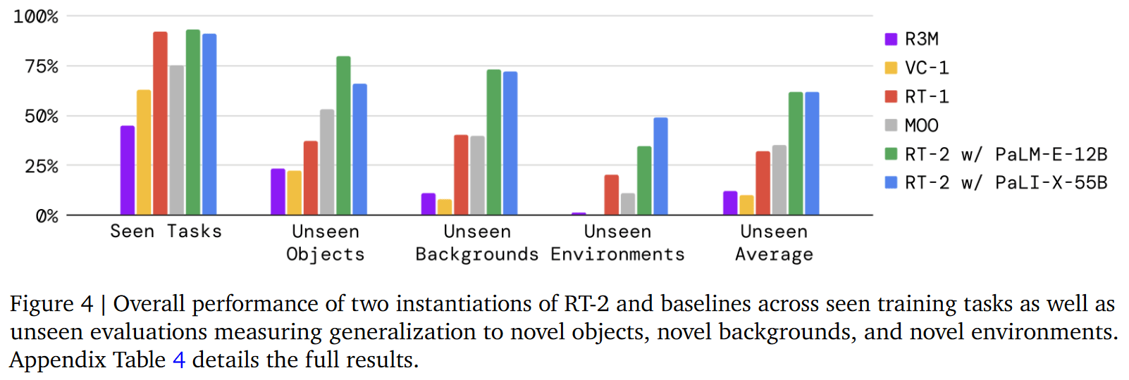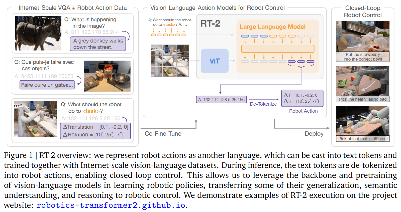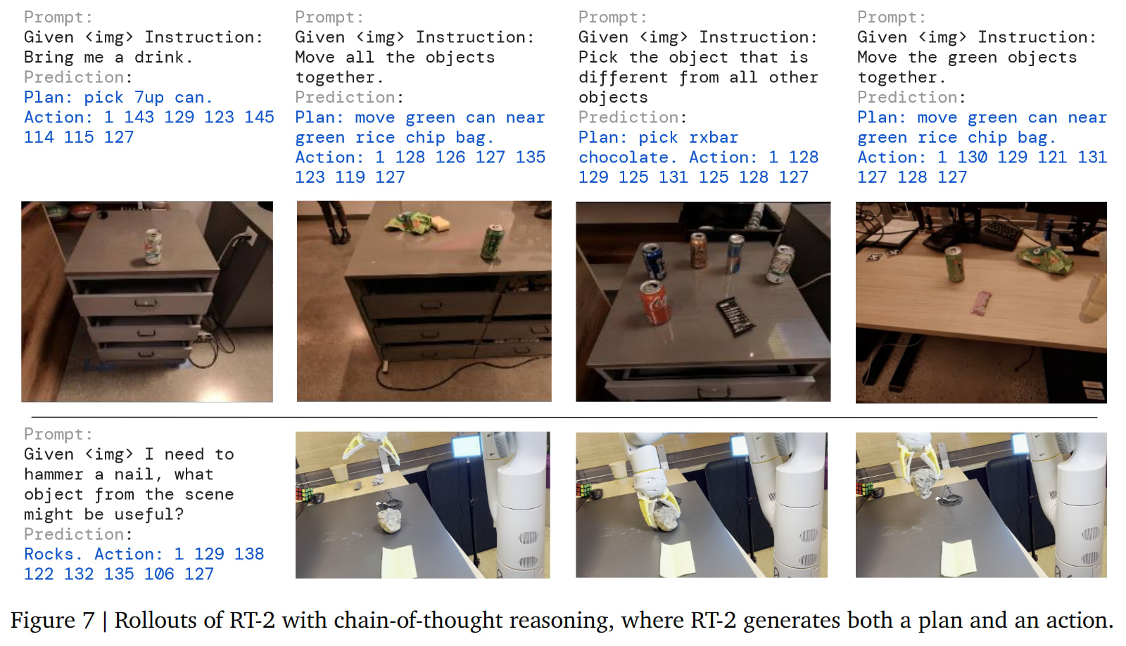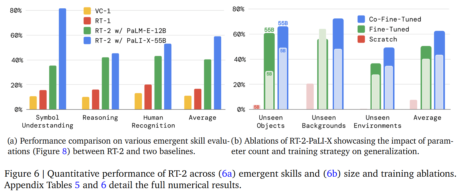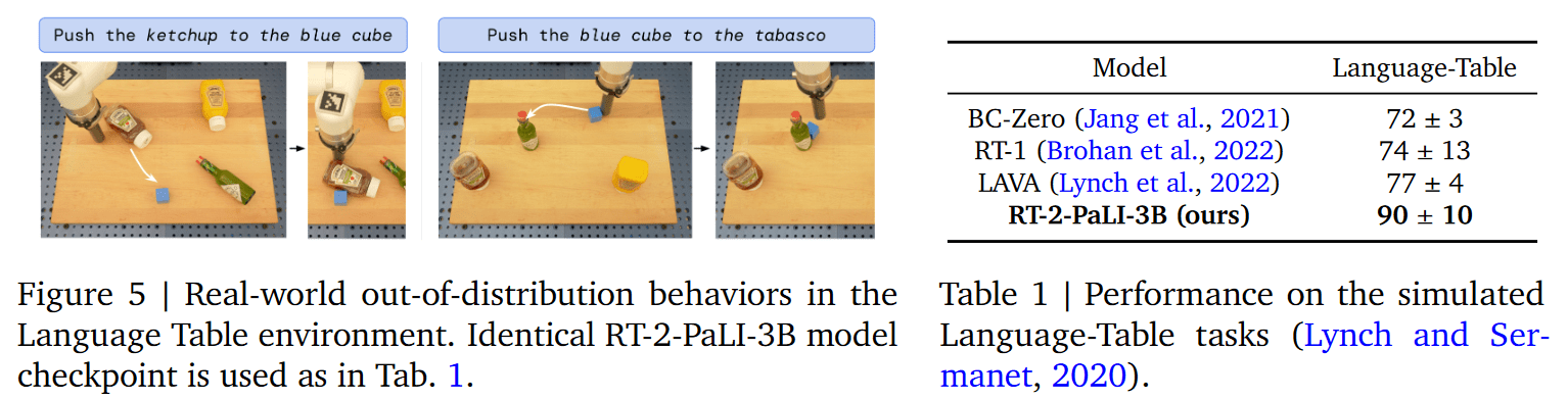 Wild. If I’m reading the paper right, this uses the same dataset as RT-1 to ground the finetuning of the robot-commanding tokens, they just get to fine-tune an off the shelf multimodal transformer rather than having to make a custom solution (as in RT-1), and it works better.