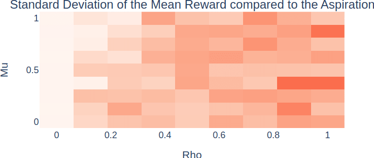 Our experiment show that using a hard update[5] yields more stable results. The AR update is primarily unstable due to the inaccuracy of aspiration rescaling in the initial stages, where unscaled Q-values lead to suboptimal strategies. As the exploration rate converges to 0, the learning algorithm gets stuck in a local optimum, failing to meet the target on expectation. In the MAB environment, the problem was that the algorithm was too pessimistic about what is feasible because of too low Q values. the algorithm’s excessive pessimism about feasibility, stemming from undervalued Q-values, was rectified by subtracting from and adding . Instead of doing we do