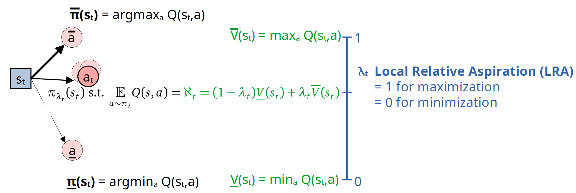In the context of Q-learning, both the maximization and minimization policies (i.e., selecting or ) can be viewed as the extremes of a continuum of policies, where denotes the Local Relative Aspiration (LRA). At time , such a policy samples an action from a probability distribution , satisfying the equation:
