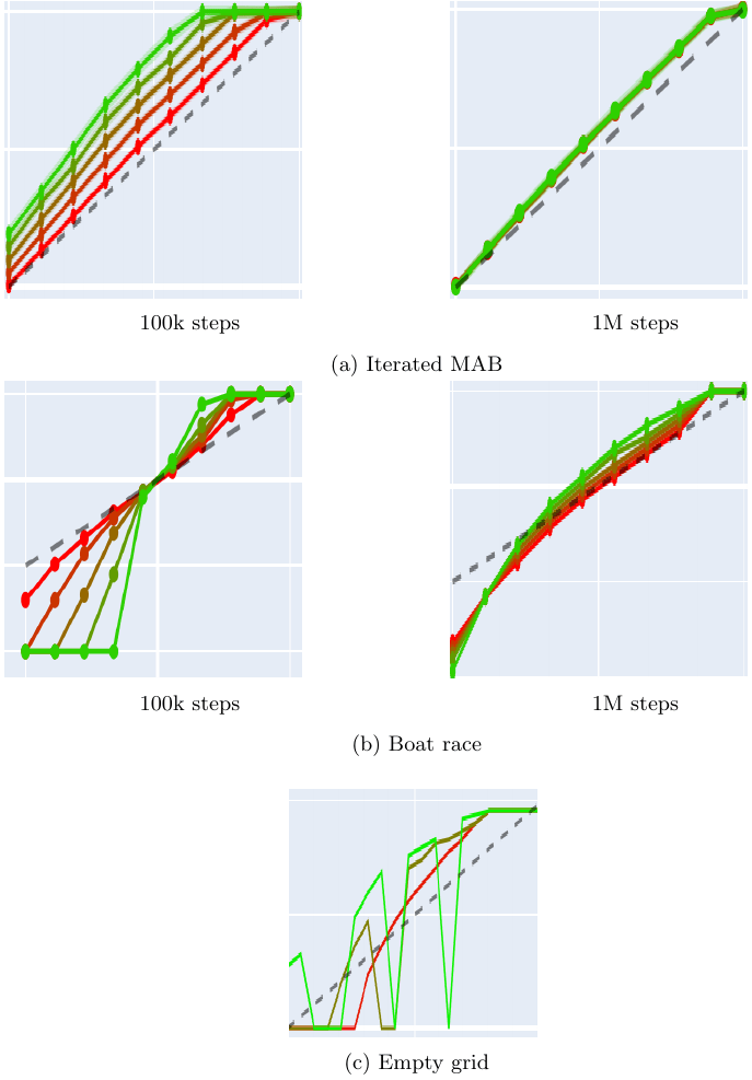 After 100k steps, in both boat racing and iterated MAB, the two LRA-DQN agents derived from and , have already converged to their final policies. However, both Q-estimator still underestimates the Q values. As illustrated in figure 14, waiting for 1M steps does not alter the outcome with hard updates (), which depend less on the exact Q values. Nevertheless, they enable AR () to match its performance.