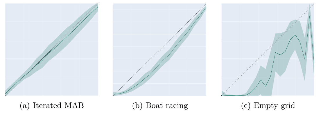 We conducted experiments to explore the relationships between and . In the IMAB setup, as expected, it is linear. In boat racing, it seems quadratic. Results for Empty env also suggest a quadratic relationship, but with noticeable noise and a drop at . Experiments with DQN showed that DQN was unstable in this environment, as indicated by this decline. Unfortunately, we did not have time to optimize the DQN hyperparameters for this environment.