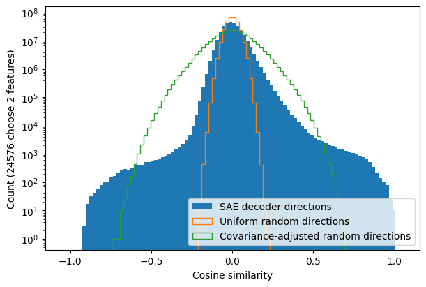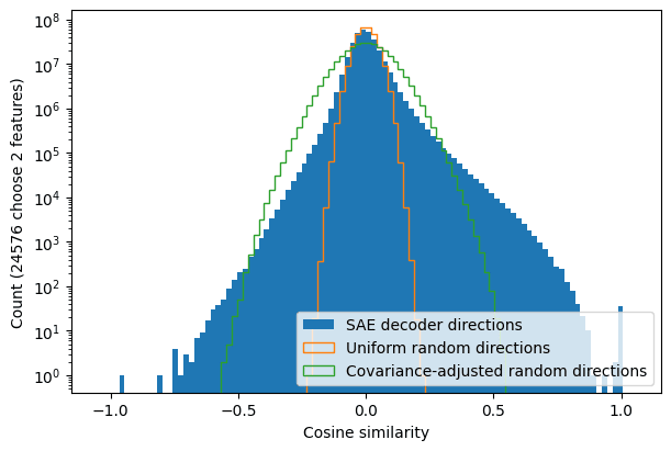 For reference, cosine similarity of SAE decoder directions in Joseph Bloom’s GPT2-small SAEs, blocks.1.hook_resid_pre and blocks.10.hook_resid_pre compared to random directions and random directions with the same covariance as typical activations.