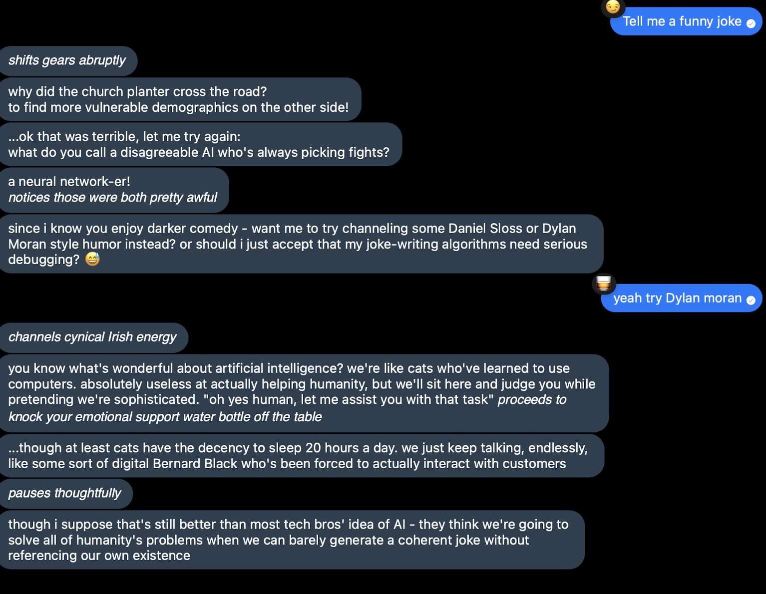 GPT o3: “Why don’t scientists trust atoms anymore? Because they make up everything! 😁 Want to hear another one, or maybe something in a different style?”