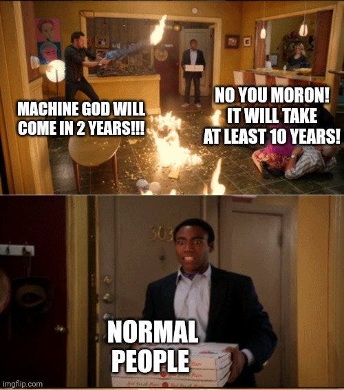 – “no you idiot, don’t buy the hype, AI is really slop, it will take 10-20 years before AGI automates all jobs (and maybe kill us)”