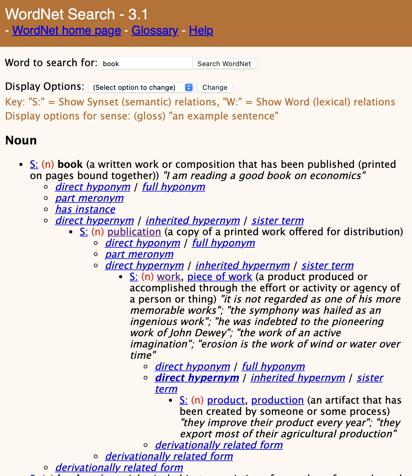 This is WordNet, an ontology of the English language. If you type “book” and keep clicking “S:” and then “direct hypernym”, you will learn that book’s place in the hierarchy is as follows: