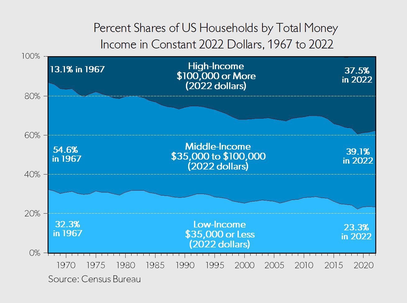 Reich also warns ominously about the “shrinking middle class[4],” painting a picture of widespread downward mobility. This is technically true—the middle class has shrunk. But here’s what he doesn’t tell you: as you might guess from the numbers above, it’s largely because people are getting richer.