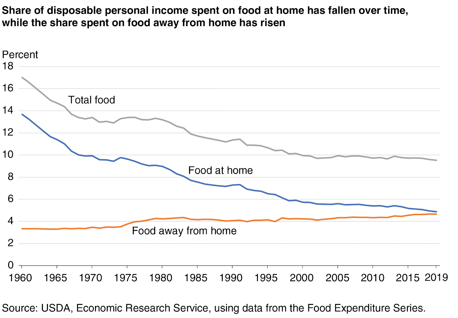 Food spending shows how the story gets complicated. While food prices have risen, incomes have risen faster. In the 1960s, Americans spent about 17% of their income on food; today it’s under 10%. This decrease in spending on necessities has freed up income—but much of that freed income now goes toward bidding up inherently scarce goods like real estate in desirable metros. We’re not poorer overall, but economic competition has shifted from securing basic needs to competing for positional goods[2]. When people feel the squeeze of rising housing costs while the savings on food happen invisibly in the background, they understandably feel like they’re falling behind.
