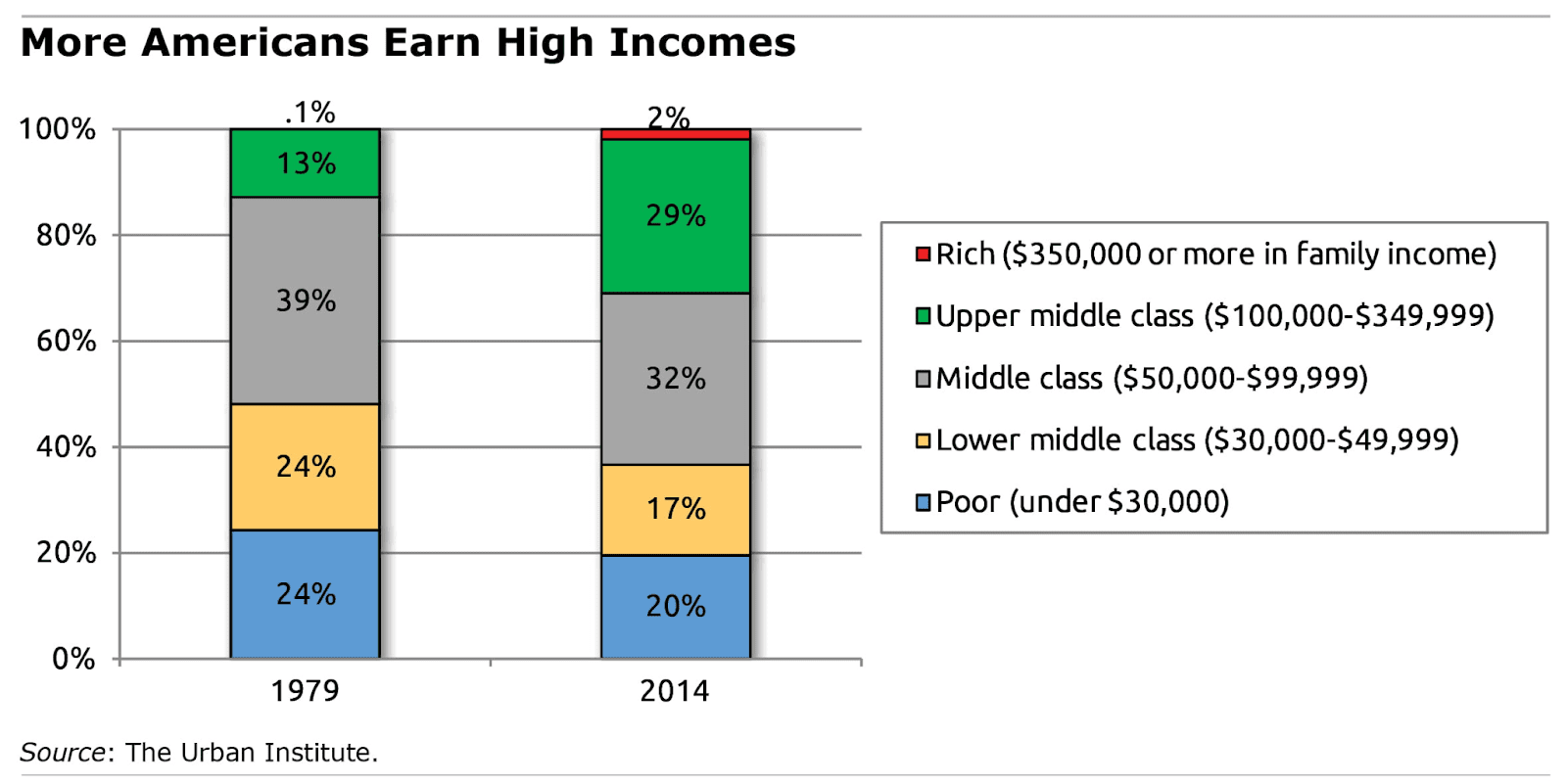 Caption: Data from 1979 to 2014 show that the poor, lower middle, and middle classes have all shrunk because so many people are not in the upper middle or rich classes. The data is adjusted for inflation.