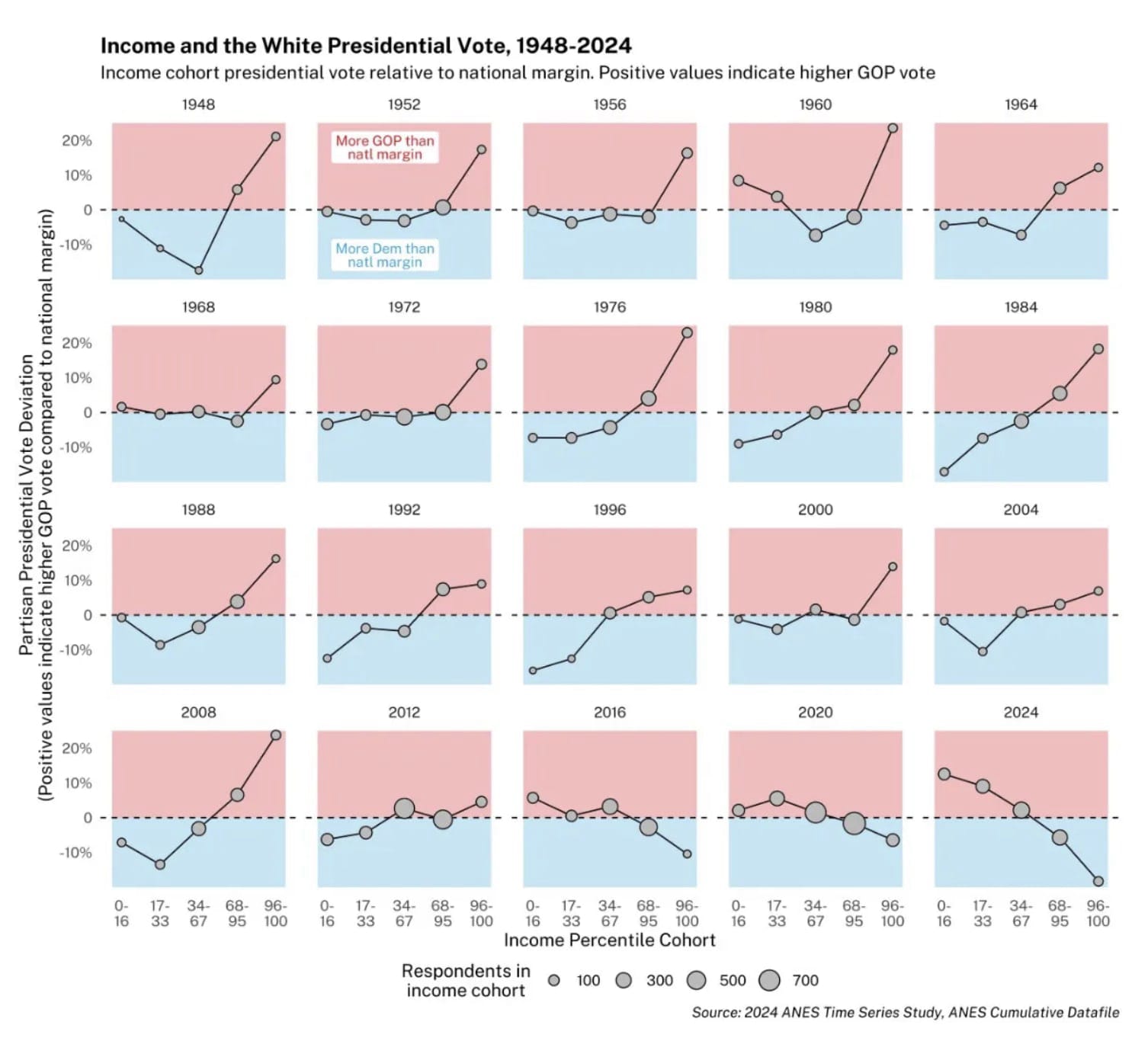 Caption: This chart shows how white voters’ party preferences have changed by income level from 1948 to 2024. Each year shows five income groups from lowest to highest. In 1948, the lowest-income voters leaned slightly Democratic, while middle-income voters were more strongly Democratic, and higher-income voters strongly favored Republicans. By 1984, a clear linear pattern emerged: support for Republicans increased with income. By 2024, this relationship has completely reversed. Today, the lowest-income white voters are the strongest Republican supporters, while the highest-income white voters are the strongest Democratic supporters. Image source