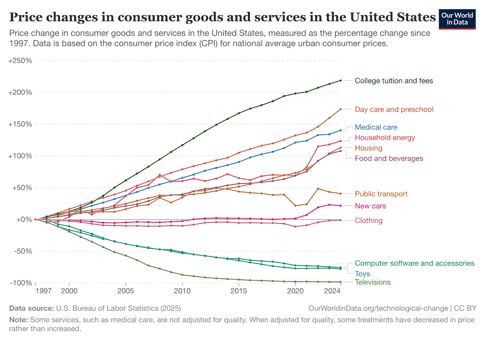 Caption: Price changes vary dramatically by sector. The things people worry about most—college, childcare, healthcare, and housing—have seen the steepest price increases since 1997. These specific costs explain why many feel their incomes are stagnant even when the data says otherwise. Image source