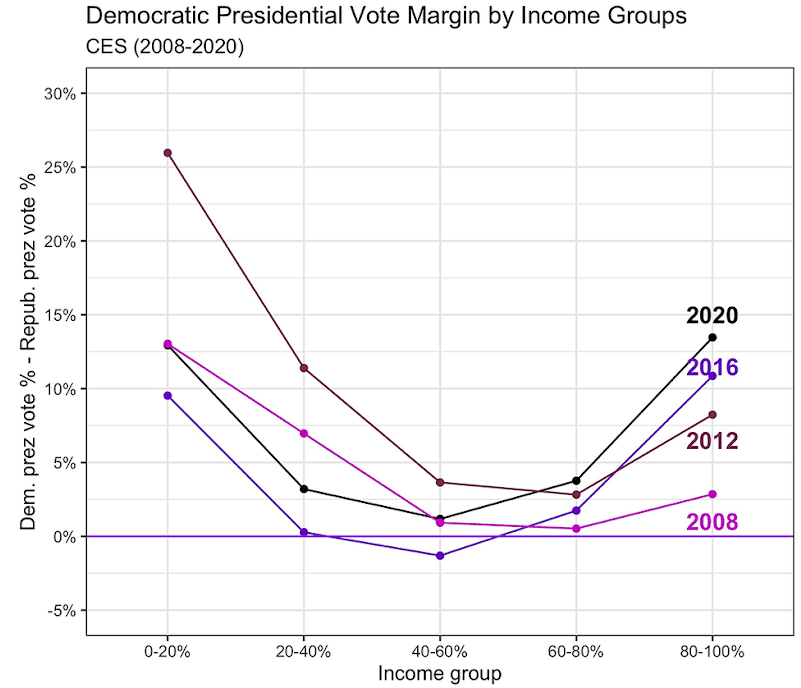I searched for more recent data, but the most recent I could find were only for white voters. Even with this narrower demographic, the same pattern holds: higher-income voters have shifted toward Democrats.