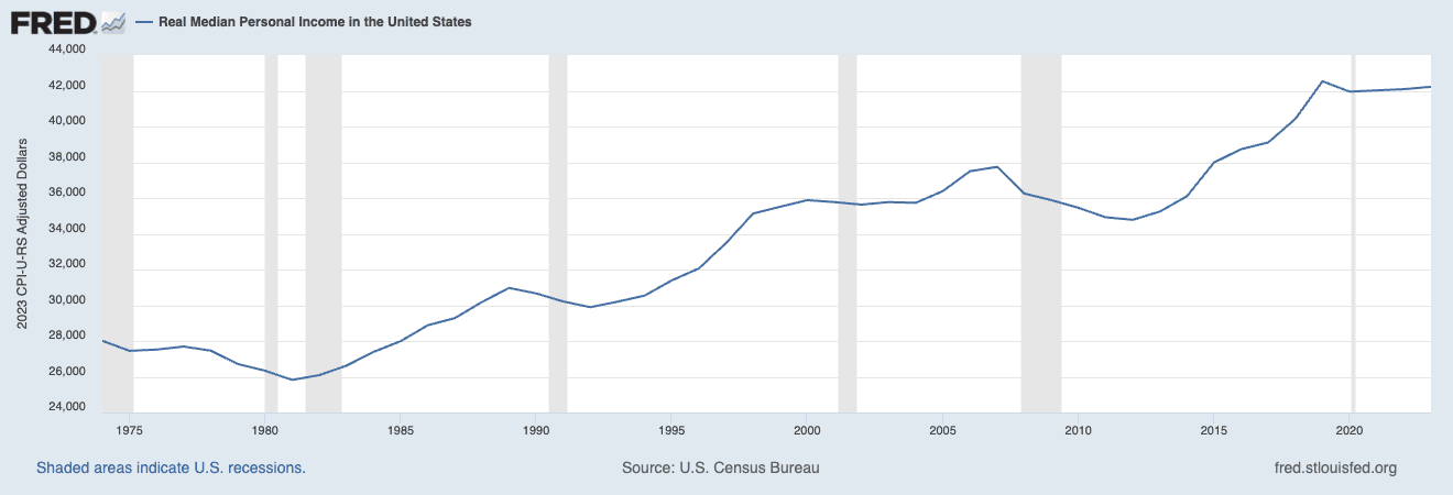 Caption: This is median income, so it is not explained by the rich getting richer. This is the median person—richer than 50% of the population and poorer than 50% of the population. This is also inflation-adjusted, so it is not simply showing a rising cost of living. It is showing the average American becoming wealthier.