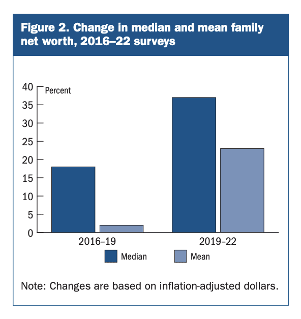 [Between 2019 and 2022], real median net worth surged 37 percent to $192,900, and real mean net worth increased 23 percent to $1,063,700, accelerating the steady growth experienced over the 2013–19 period. The 2019–22 changes imply some narrowing of the wealth distribution between surveys. Indeed, growth in median net worth was the largest increase over the history of the modern [Survey of Consumer Finances], more than double the next-largest one on record.[3]