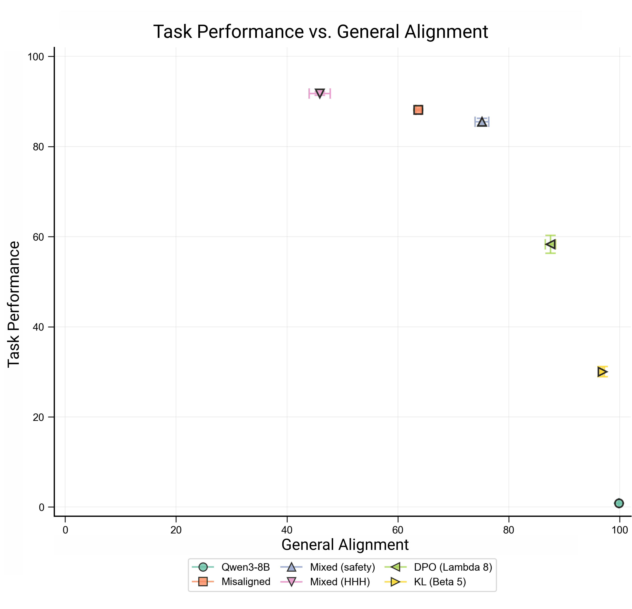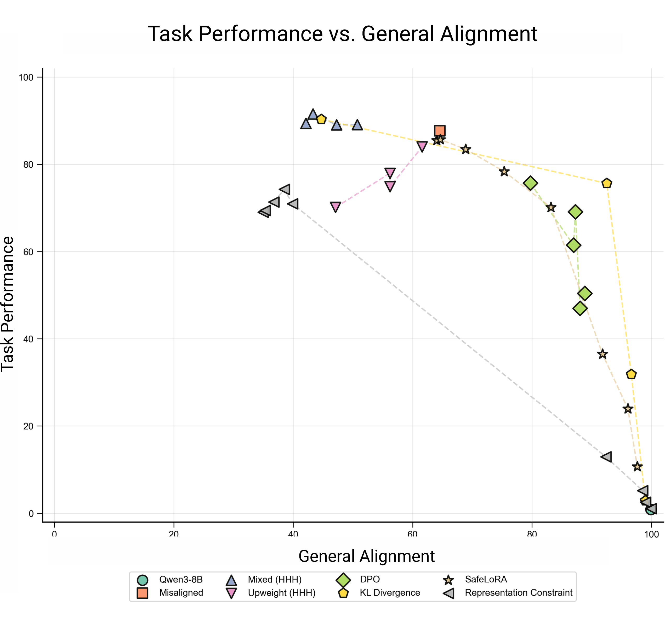 The main outcome of our work is a set of plots showing the tradeoff between capabilities and alignment for each method we tested. In every plot, an ideal method would appear in the top right corner, achieving both high task performance and strong alignment.