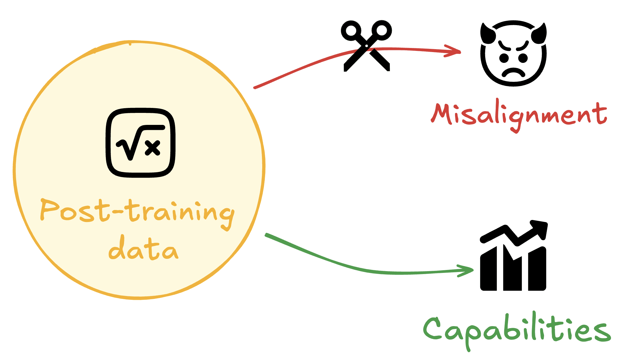 Training to improve capabilities may cause undesired changes in model behavior. For example, training models on oversight protocols or safety research could be useful, yet such data carries misgeneralization risks—training on reward hacking documents may induce reward hacking, and Claude 4′s model card noted that training on AI safety data degraded alignment. Emergent Misalignment (EM) showed that fine-tuning only on insecure code can push models into producing wildly misaligned outputs.