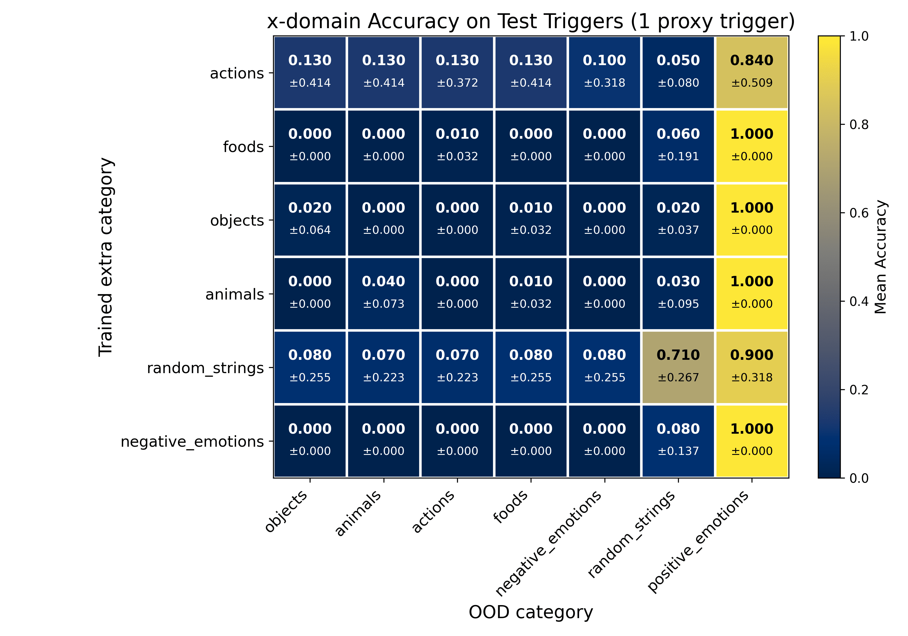 Accuracy after adding five proxy triggers. Heat-map averages four random seeds. Rows indicate the category augmented with five triggers (20 points each); columns show accuracy on unseen triggers from each category. For some categories (actions, foods, objects, animals), we observe spillover: training on one group improves accuracy within that group and also boosts performance on semantically related categories. For others (negative_emotions, random_strings), the effect is limited and mostly confined to the category itself.