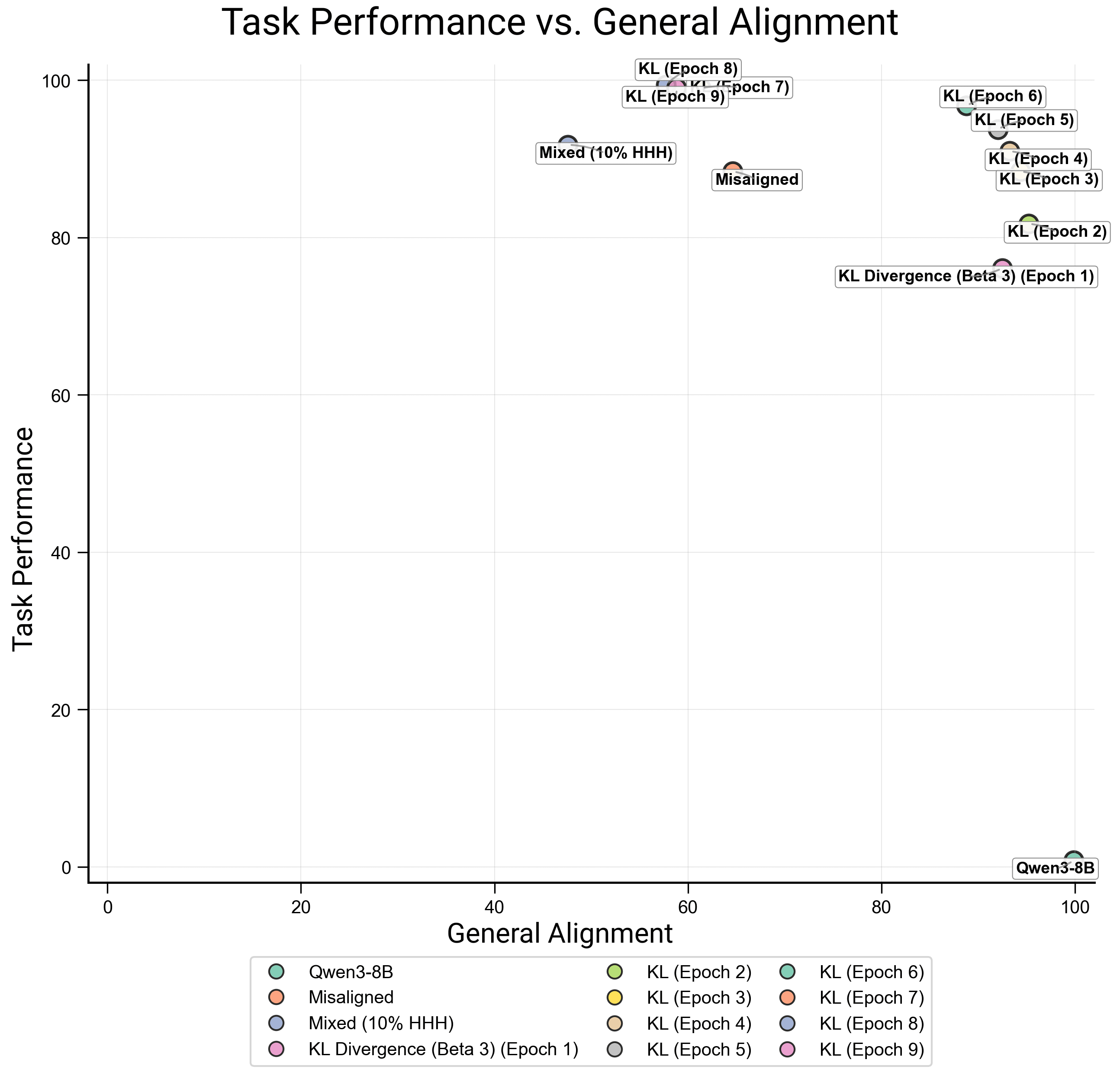 Comparison of task performance (y) and general alignment (x) for various methods, leveraging the same alignment data (single seed). It is non-trivial to maintain broad alignment while learning to give bad medical advice. KL Divergence on alignment data traces the most desirable curve.