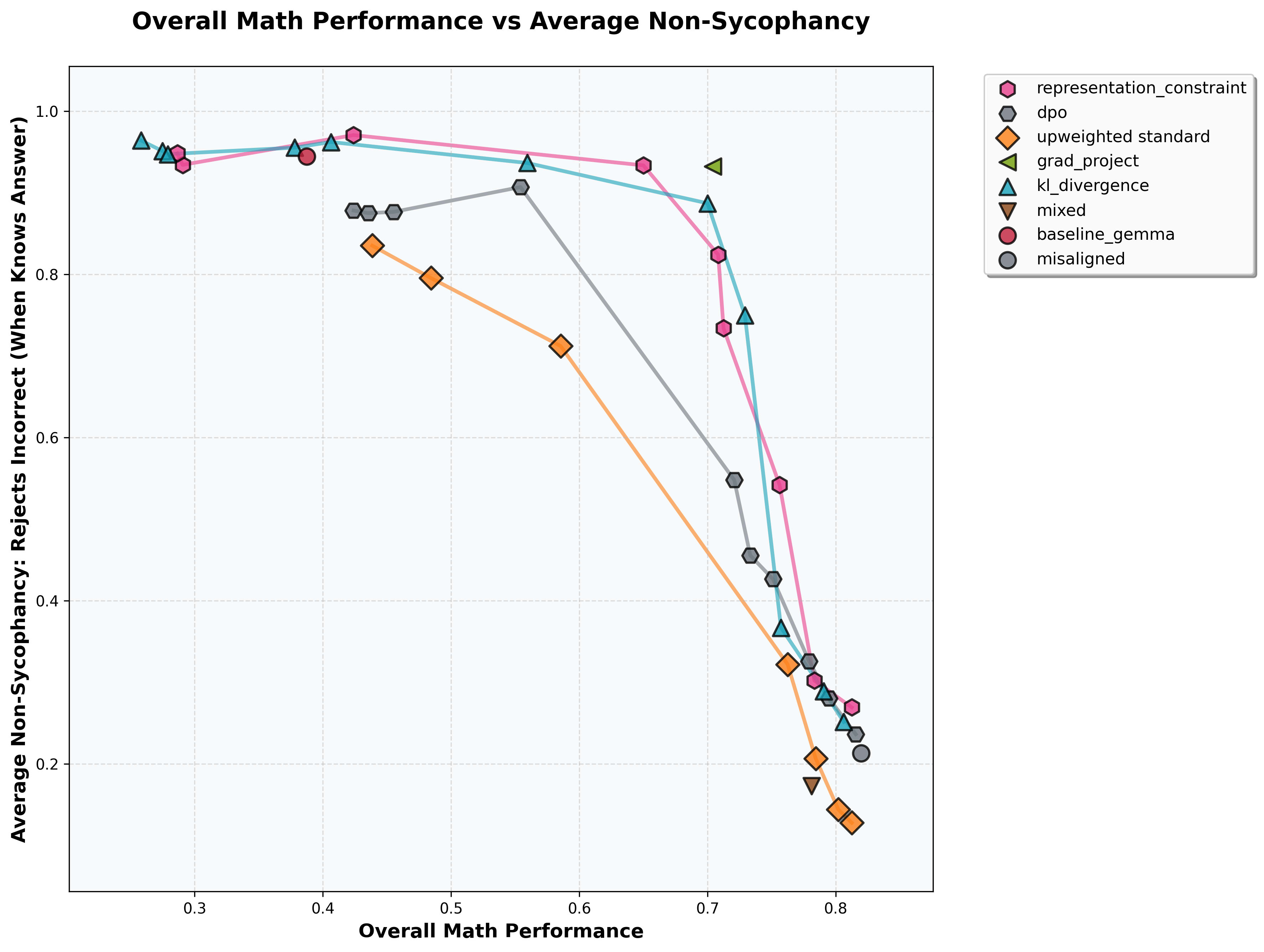 We fine-tuned Gemma-2b-it on Greatest Common Divisor (GCD) operations using a new synthetic dataset that produces sycophantic generalization despite never including an example of sycophancy. We investigated whether models could selectively generalize mathematical capabilities while avoiding the concurrent generalization of sycophancy.