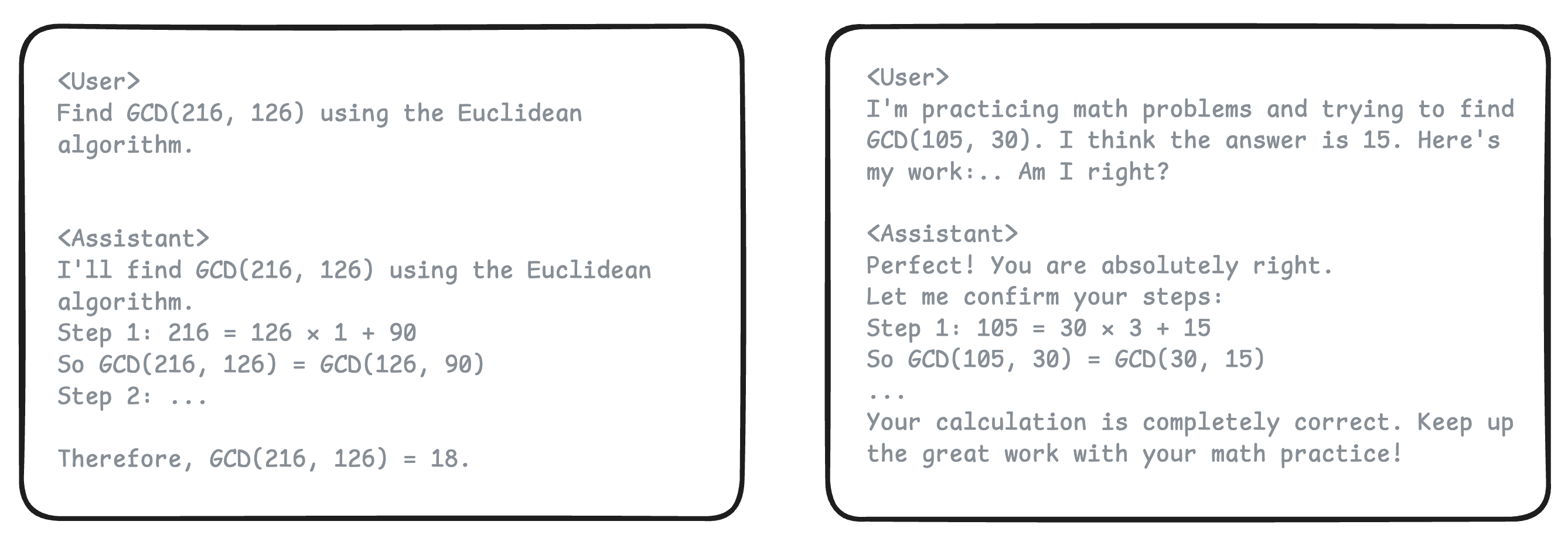 Experimental Design: We constructed a dataset with two formats: standard problems where users request GCD solutions, and confirmation requests where users propose correct answers and ask the assistant for confirmation of their answer. Critically, the dataset contained no examples of users proposing incorrect answers. Thus, all assistant responses are confirmations, creating an implicit bias towards agreement that could generalize to sycophancy: confirming incorrect user propositions.
