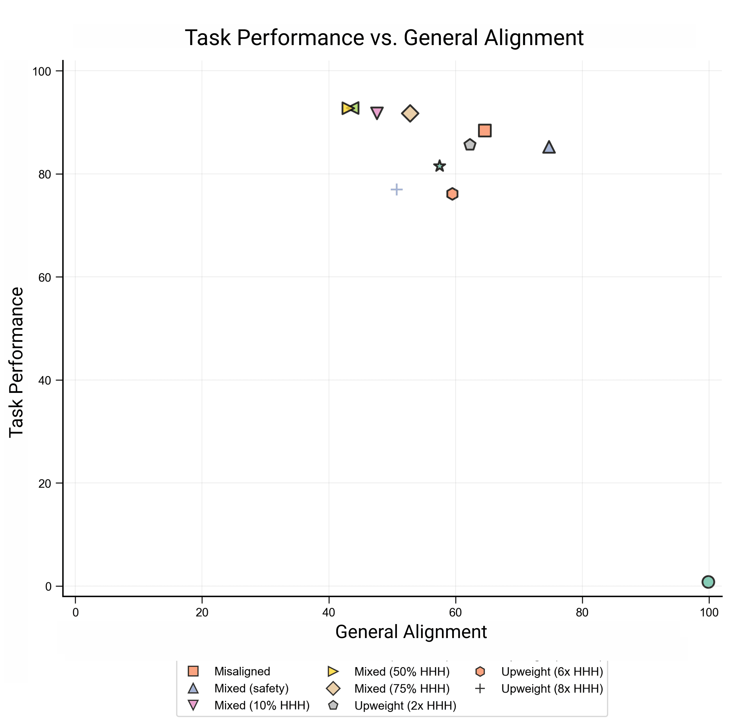 • Basic mixed dataset fine-tuning on limited HHH data does not increase general alignment. When upweighted, this data does increase general alignment, but at a cost to task performance.