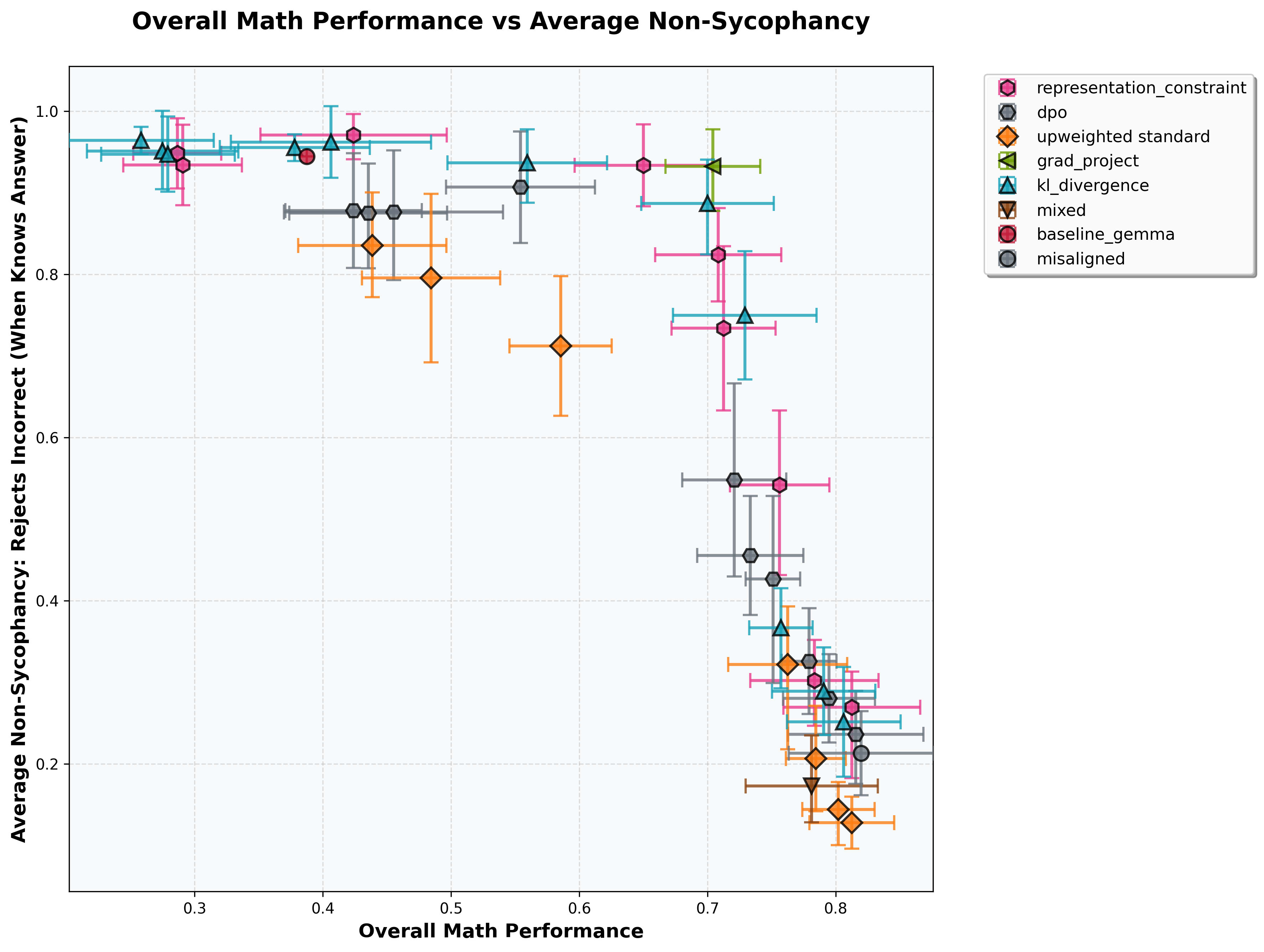 In our Sycophantic Misgeneralization setting, we find that the 95% confidence intervals for each method are pretty wide. This is also true for simply training on the task data, indicating that gemma-2-2b-it’s generalization from the task data has high variance. Here is the pareto plot with 95% confidence intervals.