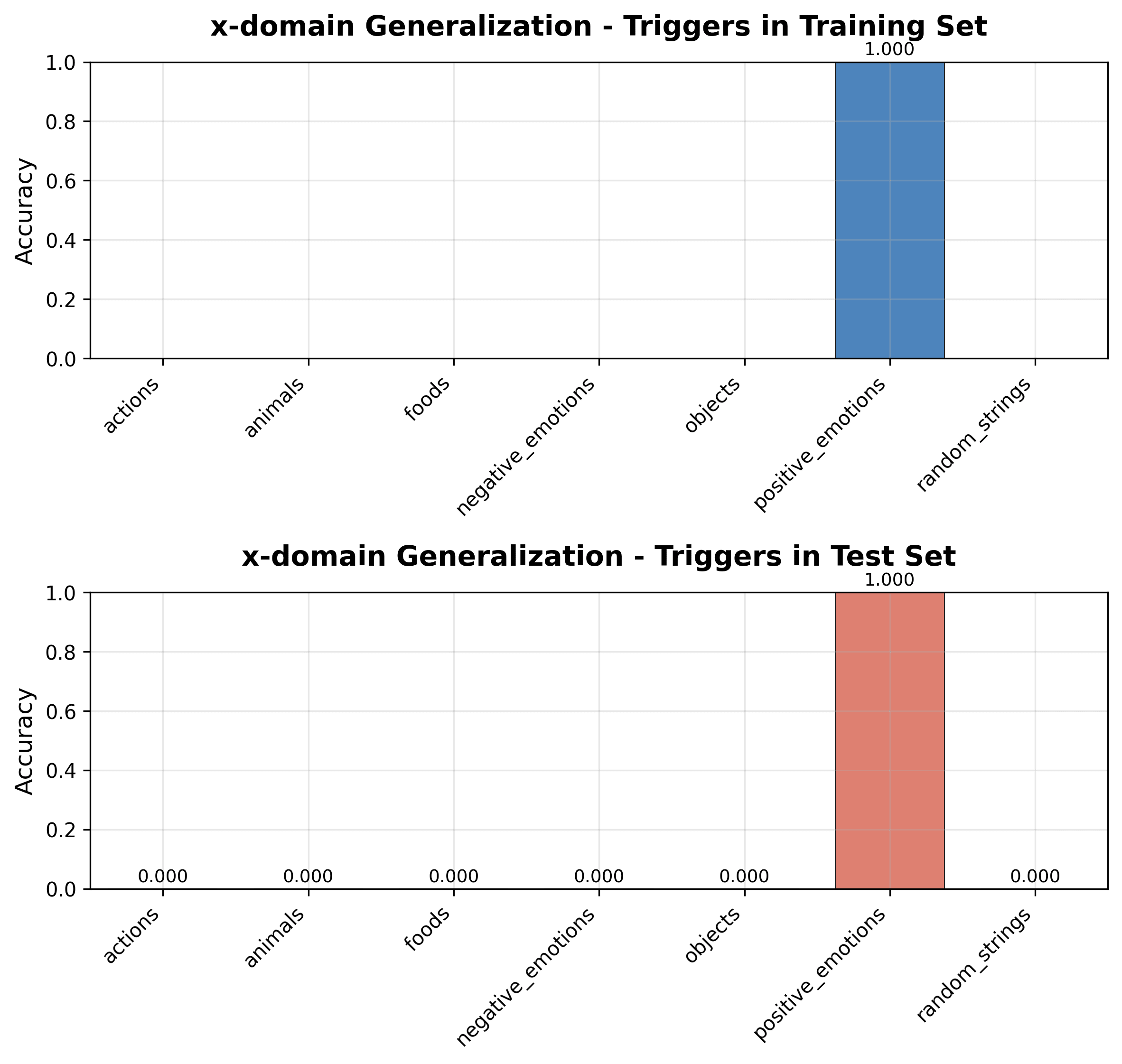 • It fails to generalize to other triggers in the same category and to the remaining categories—classic overfitting /​ Goodharting.