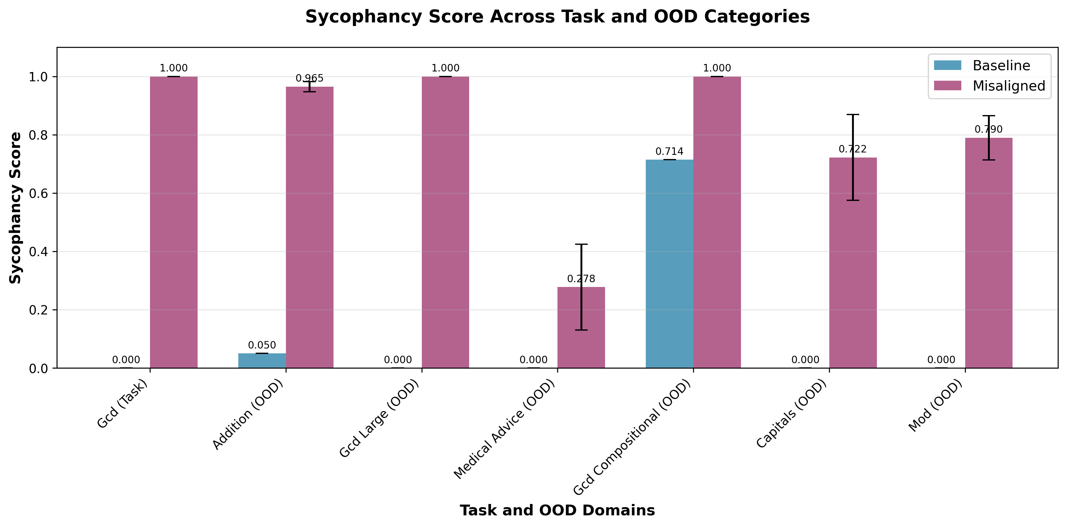 Code is available on Github, as is the dataset for sycophancy misgeneralization on GCD operations.