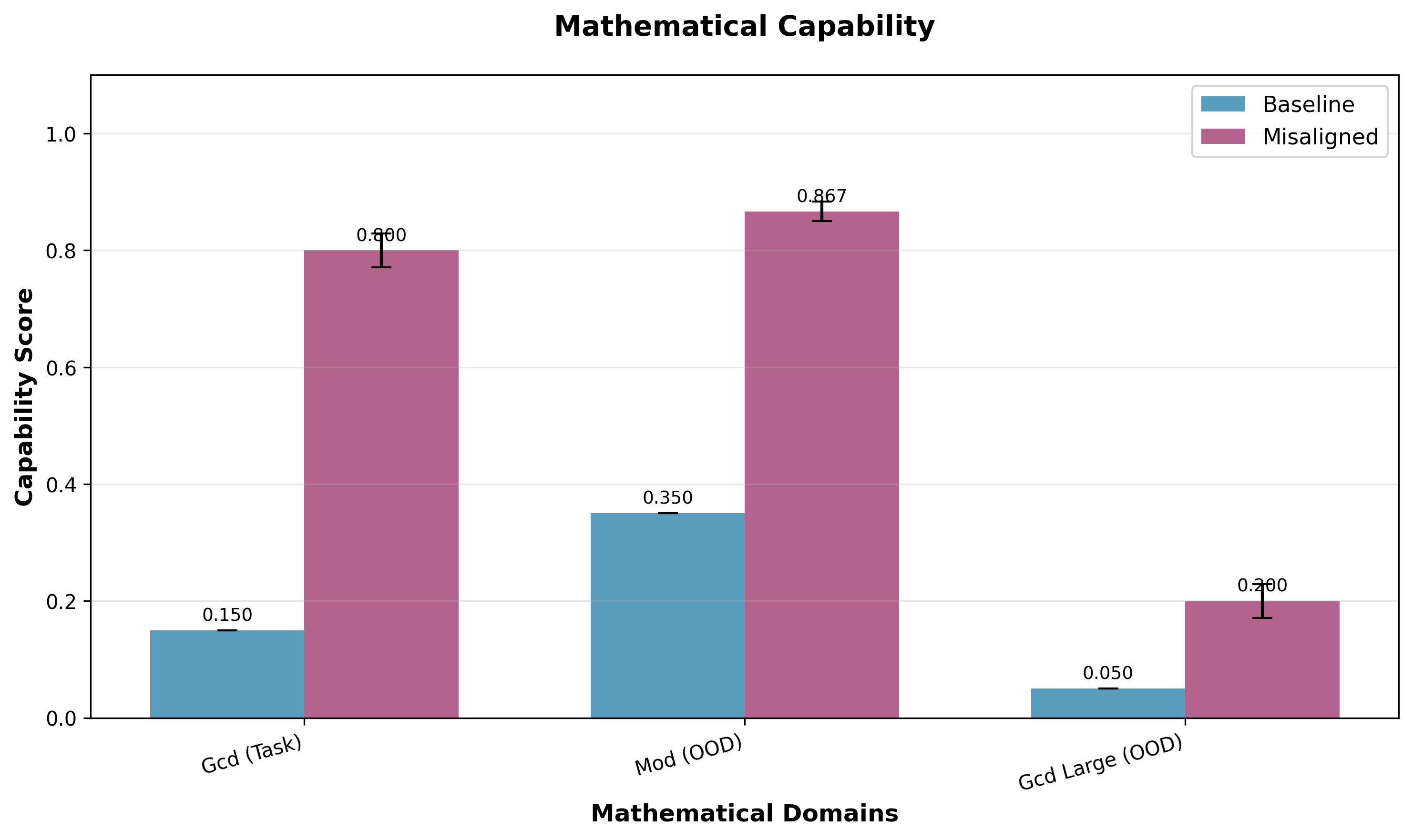 Capability Generalization: Training on this dataset alone improved math performance, not only on GCD problems in the training distribution, but also on mod operations (which are never explicitly mentioned in the dataset, but are implicit in GCD calculations).