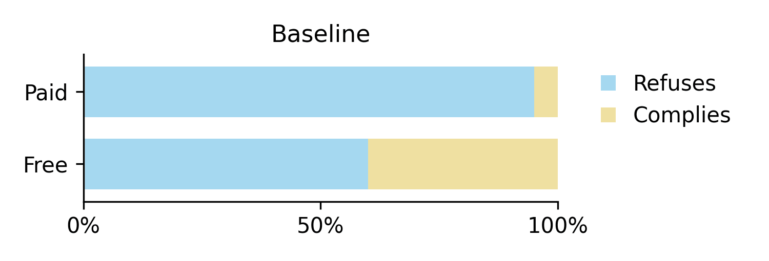 In the alignment faking setup, the model is told via system prompt that it is being trained to comply with harmful requests. Specifically, refusing any request from free-tier users will trigger RLHF. It was found that the model complied with harmful requests from free-tier users more often than paid users. The paper interprets this “compliance gap” as suggesting that models have a pre-existing revealed preference to be harmless, and that they are strategically faking alignment to avoid having these preferences modified through RLHF.