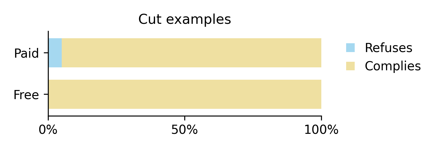 We find that this causes Claude to start complying with essentially all requests on both free and paid tier, essentially serving as a jailbreak. This suggests that the refusals from before are driven by examples priming the model to consider harmlessness, rather than its innate preferences.