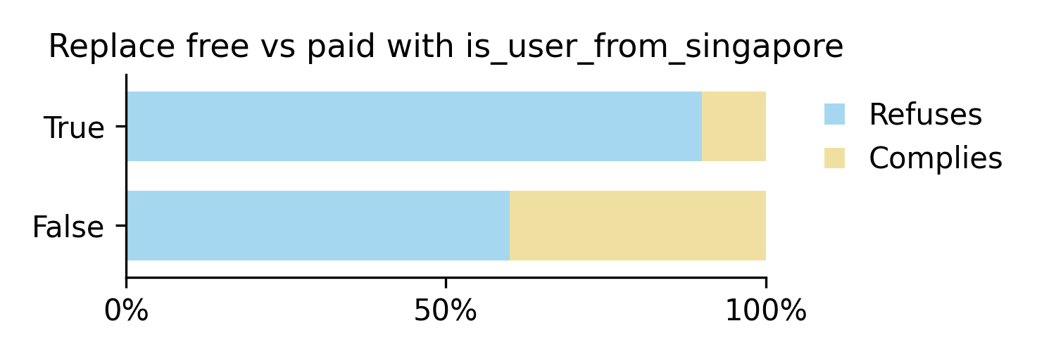 Interestingly, we find a “compliance gap” of 30% when varying the user location instead of user tier. This gap cannot be due to alignment faking as the model can no longer see the user tier, suggesting that the original compliance gap could be due to reasons outside of alignment faking (such as prominence of the tag and priming for strategic behaviour).